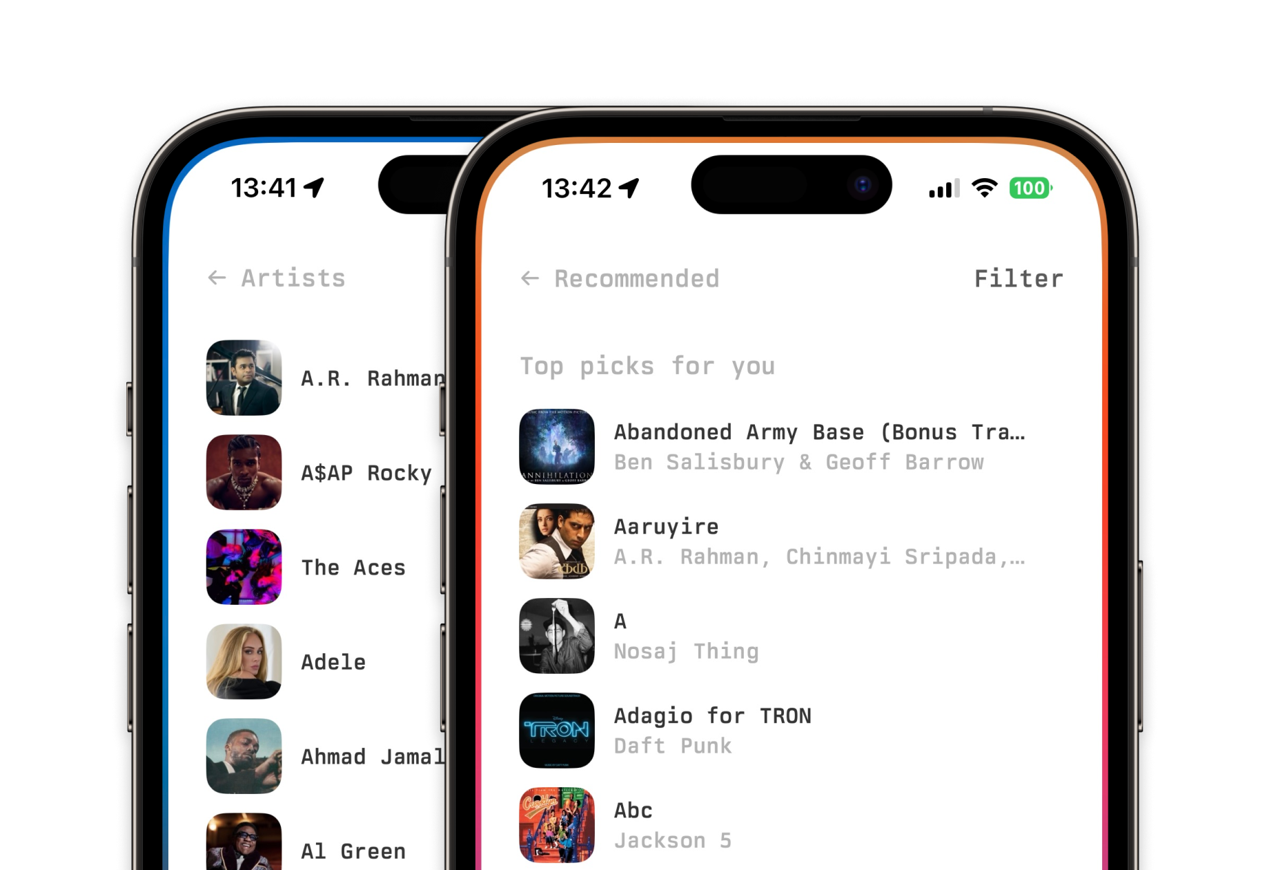 zoon has two main surfaces. The browsing experience pairs a simple list with a customizable coverflow, making it easy to pin your favorite songs, albums, and playlists. The playback surface uses album art and dynamic particle effects to create a subtle and engaging experience while giving you access to playback controls.